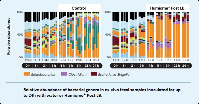 Humiome® Post LB可增加双歧杆菌的丰度。明显增加,24小时期间丰度高达>80%
